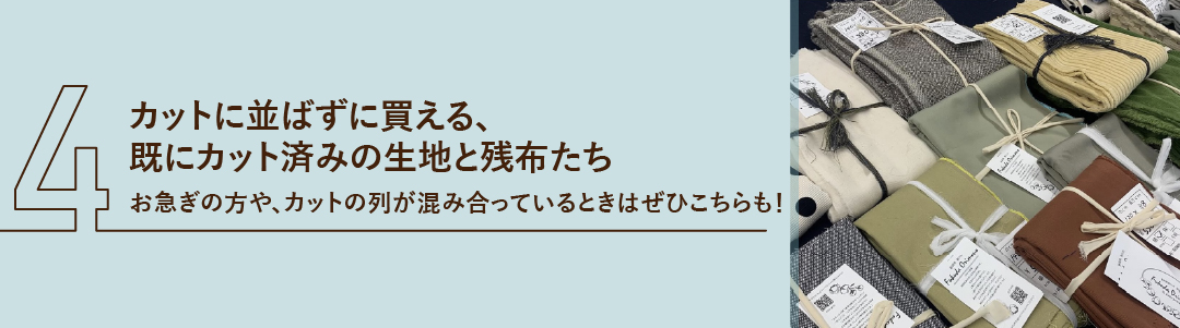 また、生地見本を作った残りなど半端に残った残布シリーズたちもkoya(製品販売エリア)で販売します。